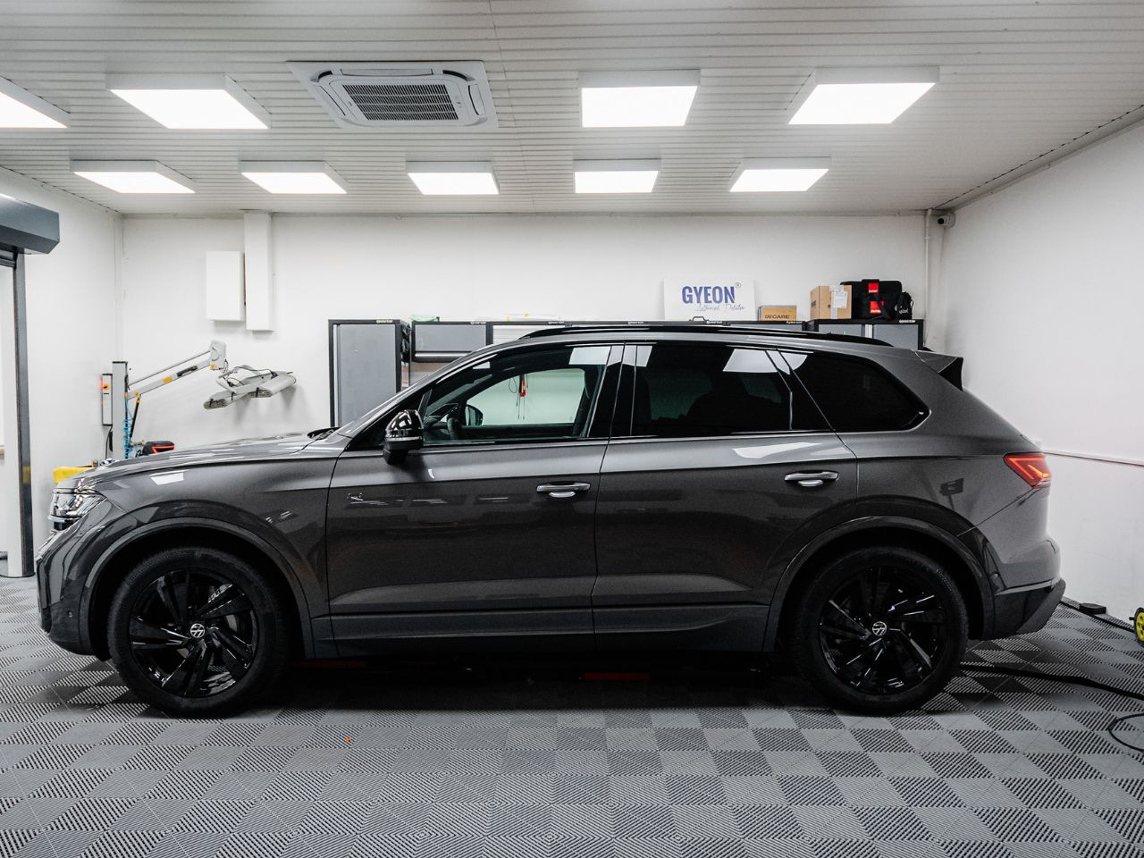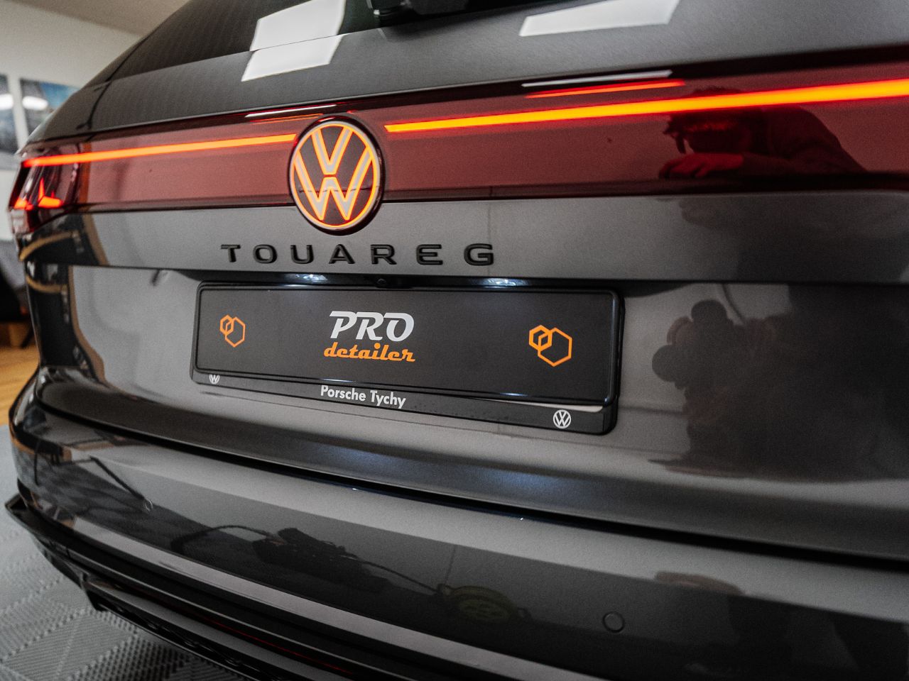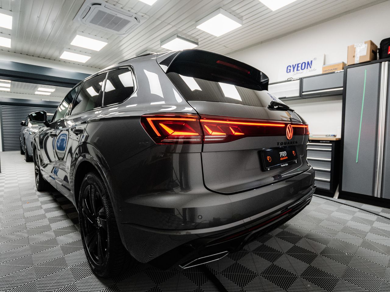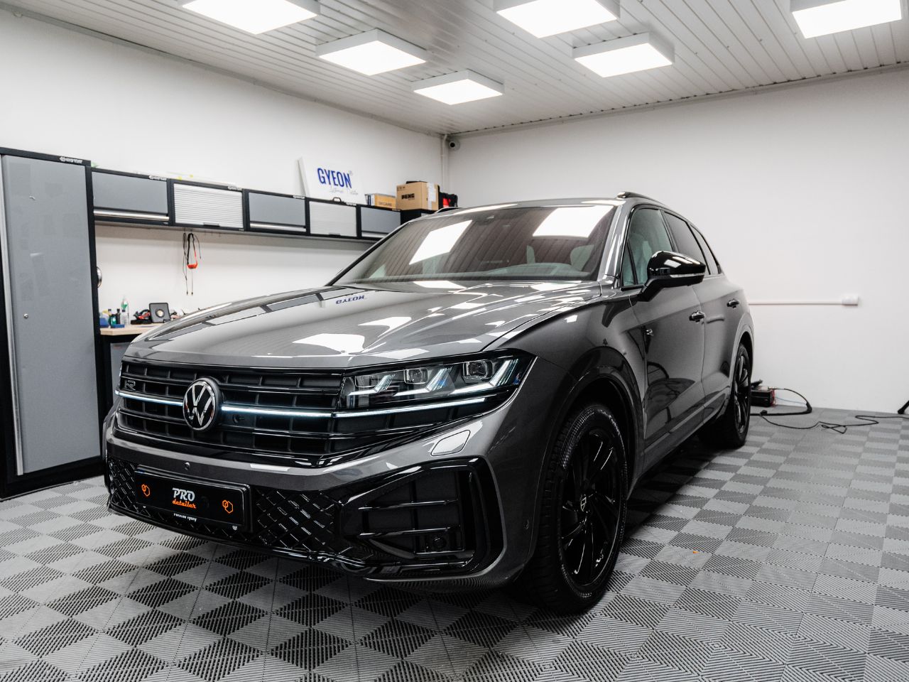 VW Touareg w naszym studiu przeszedł kompleksową ochronę lakieru. Przód auta został zabezpieczony bezbarwną folią PPF w wariancie Full Front, chroniącym najbardziej narażone elementy przed odpryskami i zarysowaniami. Na pozostałą część karoserii zaaplikowaliśmy powłokę ceramiczną, która nadała głębi koloru, połysk oraz długotrwałą ochronę przed czynnikami zewnętrznymi.